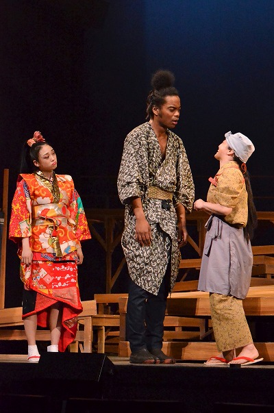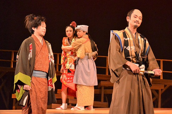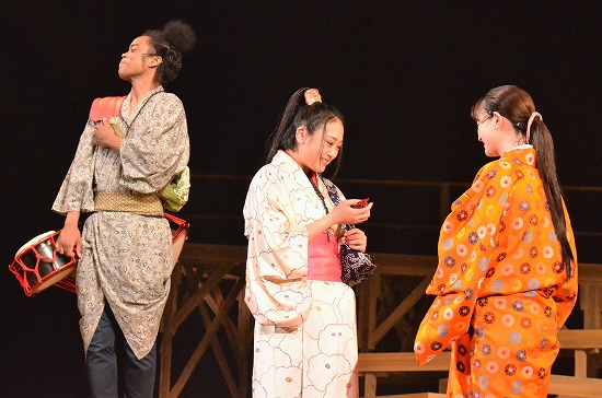 メインステージに藤次郎、小平太、ちほ、弥介が勢揃いしたときの迫力は圧巻そのもので、3人がかき鳴らす三味線、笛、太鼓の力強い音のリズムにちほの舞いが加わるとそれはまさに“ライブ”。対する出雲のお国の舞いには伝統と歴史を感じるしとやかさが表現され、2つの一座のパフォーマンスが対象的に描かれる。