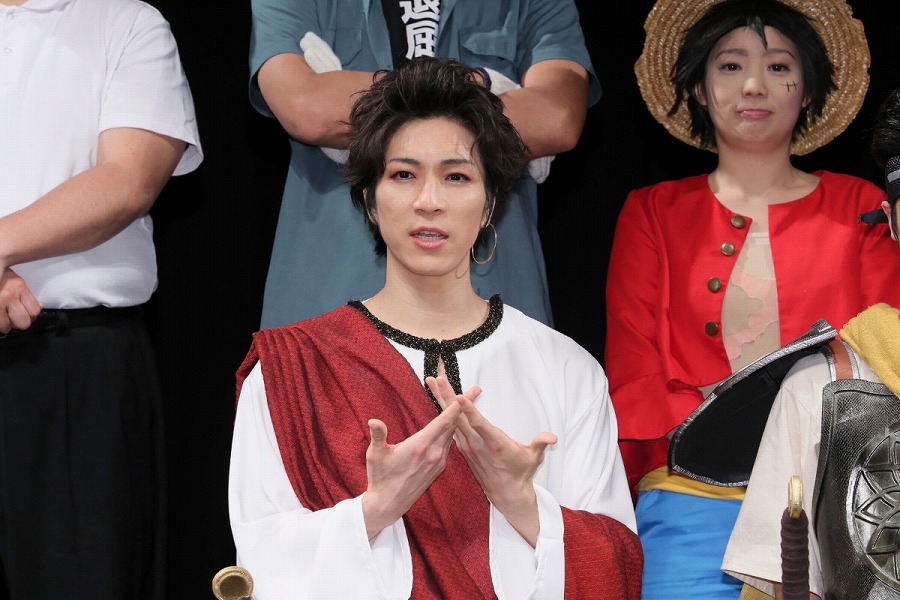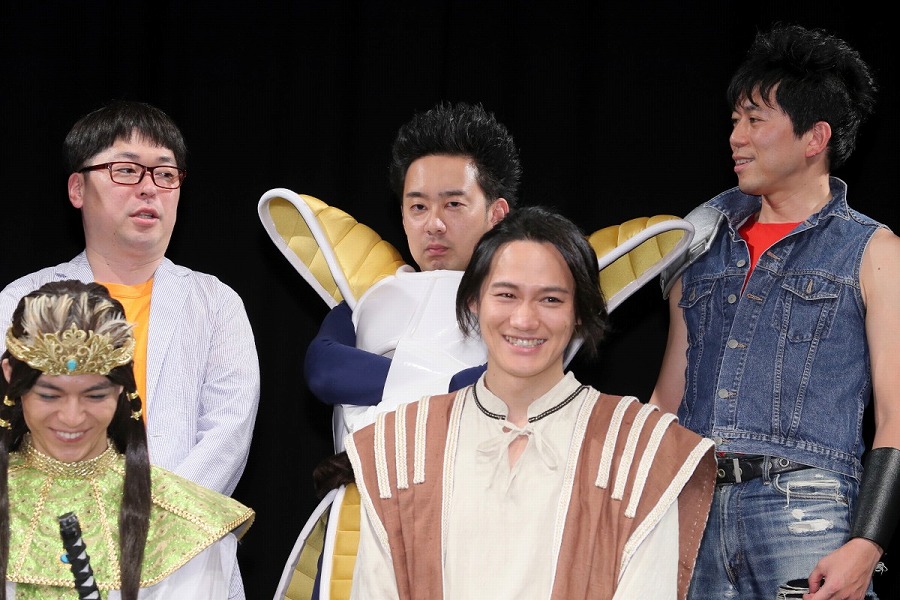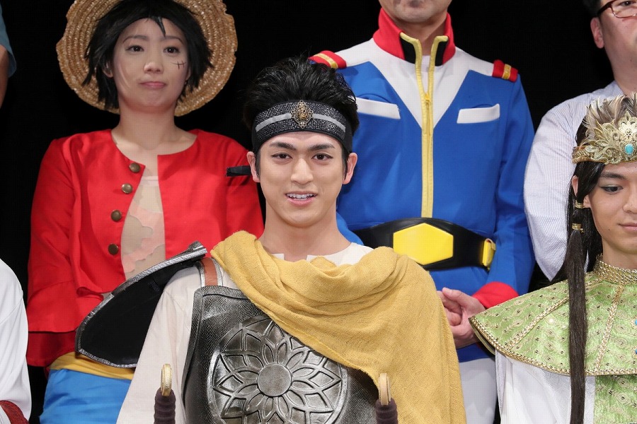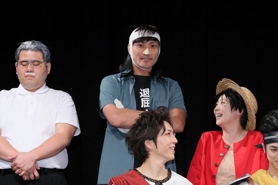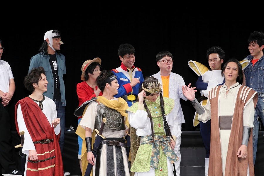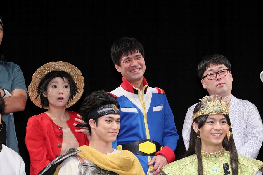 続けて、芸人の面々もコメント。キャプテン★ザコは「稽古中には、意見のぶつかり合いとかが結構あって……」と真面目に語り出すも、「そんなのやってませんよ」とまわりから総ツッコミ。ケンシロウの風貌で登壇したしまぞうZは、前日に子どもが生まれたことを明かし「娘のためにも頑張ろうと思います!」と意気込んだ。また石川は、「イケメンの俳優さんたちと共演するので、(モノマネをしている)ルフィがおばちゃんにならないように頑張ります!」と宣言。共演陣も沸かせ、賑やかにコメント。