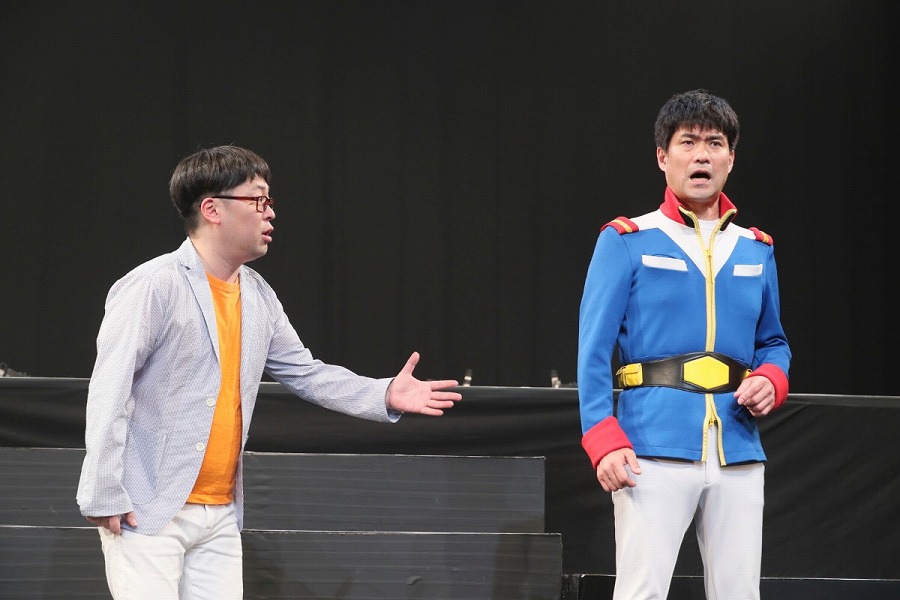 本公演で物語の舞台となったのは、地球人・向が宇宙旅行で訪れた「サンドロイド」という惑星。多くのアニメキャラが実在しているというこの惑星で、向はアムロ・レイやアニメ好きの青年と出会い、行動をともにすることになります。そして、この出会いを機に、サンドロイド全体を揺るがす王位継承問題に巻き込まれていくことになる。