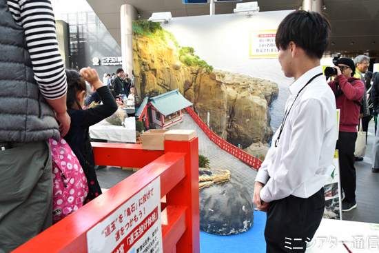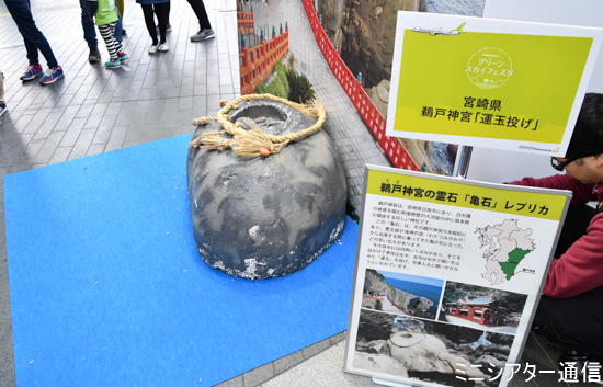 さらに、「しおりつくり体験−熊本の香りをのせて−」(熊本県)、「波佐見焼 アクセサリーづくり体験」(長崎県波佐見町)などのワークショップも開催。子どもたちを中心に、熱心に特産品づくりに挑戦。「鵜戸(うど)神宮『運玉投げ』」(宮崎県)のブースでは、宮崎県日南市の断崖絶壁の大洞窟に本殿が鎮座する鵜戸神宮の「亀石」のレプリカが用意され、亀石の背中の四角いくぼみを目掛けて、男性は左手で、女性は右手で願い事を込めた「運玉」を投げ込んでいた。