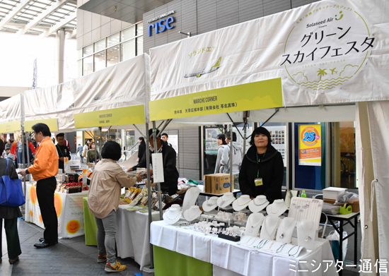 ガレリアにて開催中。初日11日は、物産ブースに加え、くまモンをはじめとする九州の人気ご当地キャラたちが多数登場するステージや、熊本の香りをのせたしおり作りなどのワークショップ、ソラシドエアのパイロット・CA・整備士の制服試着&撮影会などが行われ、親子連れをはじめ多数の来場者で賑わった。