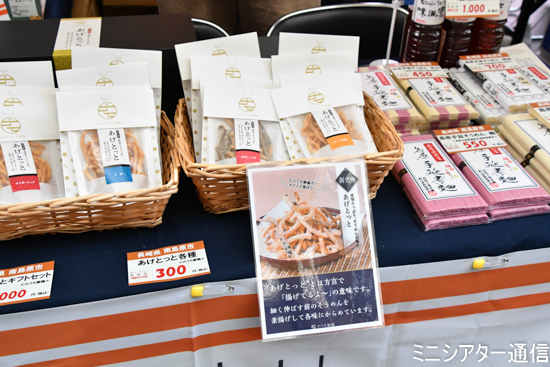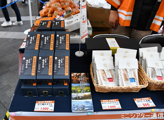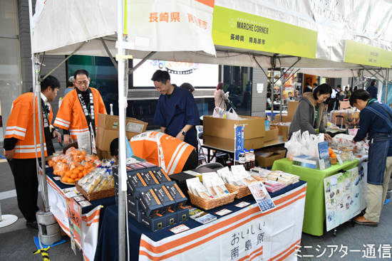会場に設置されたキッチンカーでは、九州の特産品を無料で配布。来場者たちはテーブルで試食、試飲を行い、舌鼓を打った。「宮崎魚うどん」(宮崎市)などのフード、「たかはる紅茶ゆるり」(宮崎県高原町)などのドリンク、「温州みかん」(鹿児島県いちき串木野市)・「芋かりんとう」(鹿児島県曽於市)などのスイーツまで豊富に撮り揃えており、キッチンカーには行列が。会場で名産品を試した来場者がブースに立ち寄り、同じものを購入する姿も見られた。