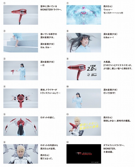「新時代の爆風」をテーマに制作された新CMでは、多忙な毎日を送る美少女がMONSTERドライヤーに手を伸ばすと、目の前のMONSTERドライヤーが突如、ロボットに進化する。そのロボットの正体がスケルトニクス(R)とコラボし機能拡張した西川なのだ。西川が「モンスタァァァー!」の叫び声とともに渾身の爆風を繰り出す場面は必見といえよう。