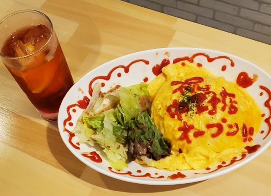 オリジナルカクテル「中野ブロードウェイ」は、中野ブロードウェイの看板をイメージした赤いカクテル。ストロベリーとジンジャエールにカットレモン、隠し味にバイオレットのシロップが入っており甘くてさっぱりした味わい。定番のメイドさんが席でお絵描きをしてくれる「Honey オムライス」もある。