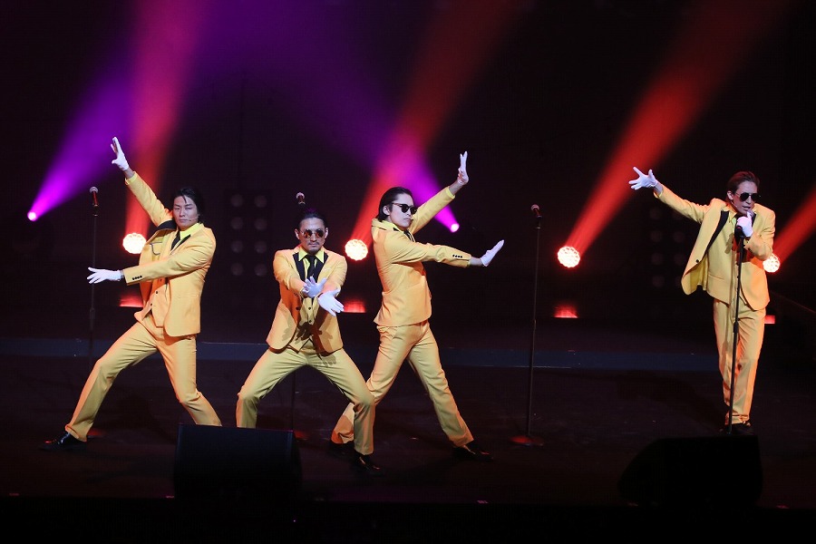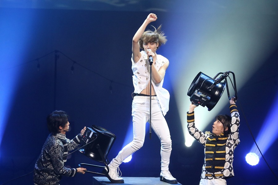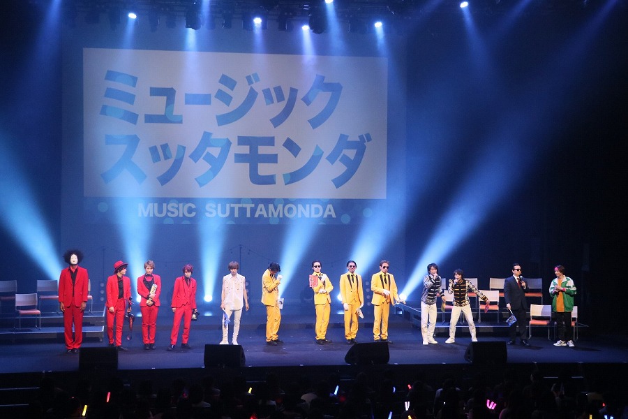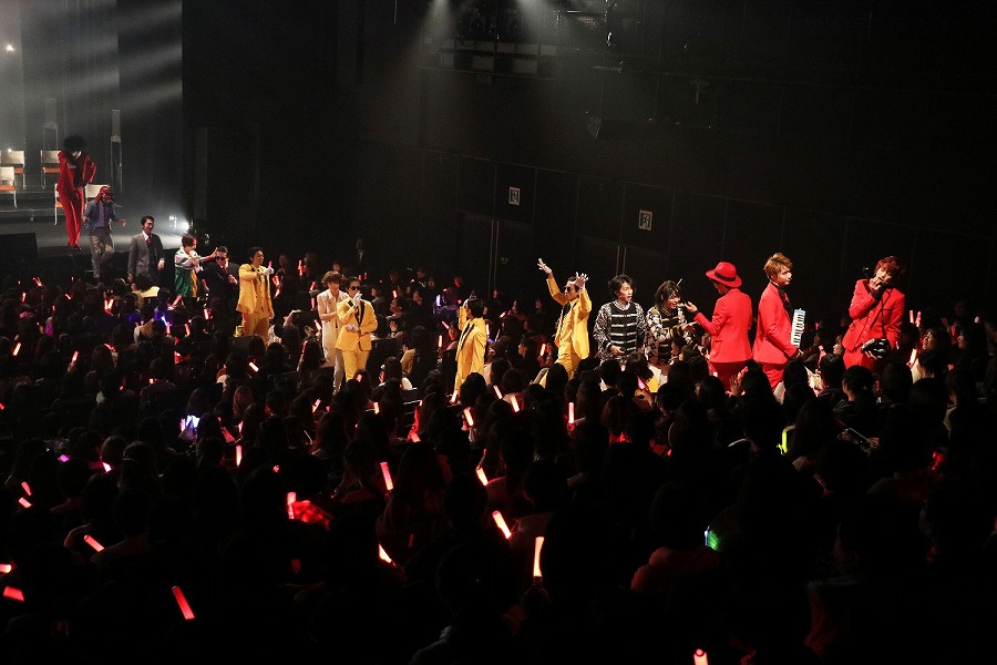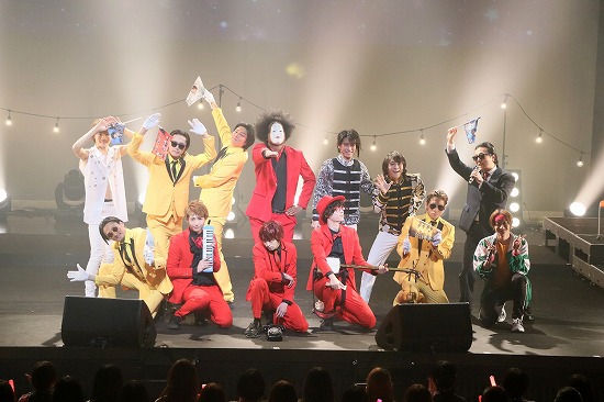 そしてこのライブの目玉ともいうべき『ミュージックスッタモンダ』では、溝口と奥谷が室町幕府の将軍足利義満と足利義政で結成したKinGin Kidsとして登場。キレッキレのダンスをしながら『室町ロマン』を披露し、陳内、株元、久保田、八神が、様々な戦いに負けた武将の気持ちを歌うルーズ&ビターの『まけ組の人』を、西郷隆盛とは似ても似つかない太田が“TSレボリューション”となり『幕末Summer Summer!』を熱唱。両サイドからKinGin Kidsのふたりが送風機で思いっきり風を吹かせ、“あの”演出を再現。そしてこのコーナーの最後に登場した杉江、井深、釣本、副島が鎌倉・室町・江戸の幕府の最後の将軍になりきり“バクフノオワリ”を結成。黒電話を発信機のように持って歌い上げ、ステージを降り、客席を練り歩き、会場は一体感に包まれる。司会に徹した石井が演じるタムラと、前回の第3弾で登場した前山が演じる森蘭丸の振り切れっぷりも印象的だった。