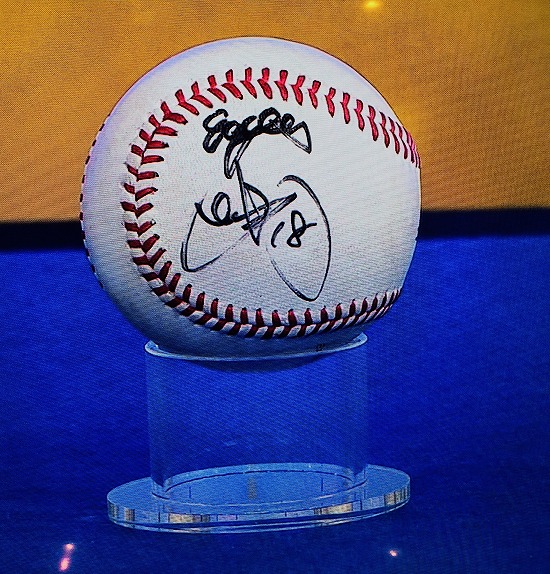 マー君のサイン入りサインボールとファウルボールを獲った時の状況を身振り手振りで説明する生島ヒロシ