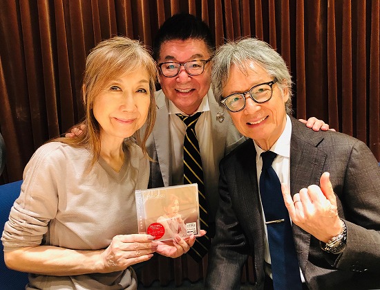 初のセルフカバーアルバム「Mari Covers」を手にコンサートへの抱負を語る高橋真梨子、生島ヒロシ、ヘンリー広瀬氏=左から